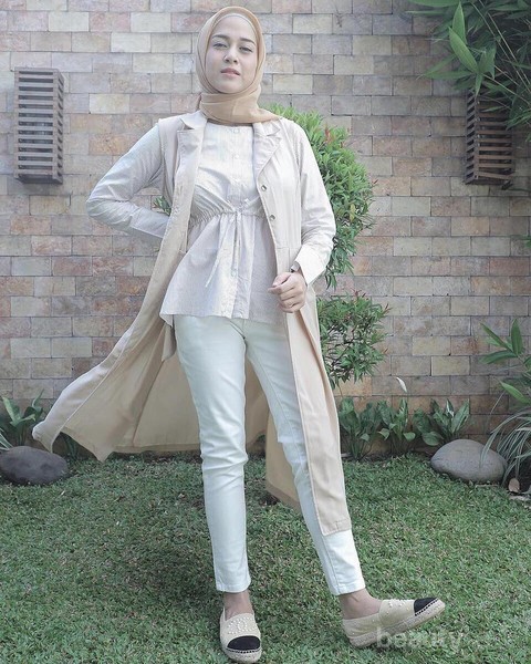 Nah, untuk kali ini Nina Zatulini memakai setelan baju formal namun tetap elegan. Agar pakaian tidak kosong atau terlihat menarik, kamu dapat memakai long outer sebagai pelengkap baju atasan kamu. Nina Zatulini memakai long outer berkerah berwarna nude, kemeja putih, celana panjang putih, hijab berwarna cokelat muda yang selaras dengan warna long outer, serta sepatu kekinian gaya anak muda dengan model Espadrilles.
