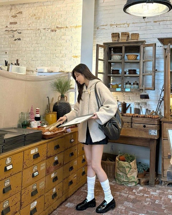Outfit ini terdiri dari jaket oversized berbahan shearling yang dipadukan dengan rok mini hitam, menciptakan gaya preppy yang nyaman dan stylish. Kaus kaki panjang putih dan loafers hitam menambah sentuhan klasik yang effortless, cocok untuk tampilan kasual di musim dingin ringan.