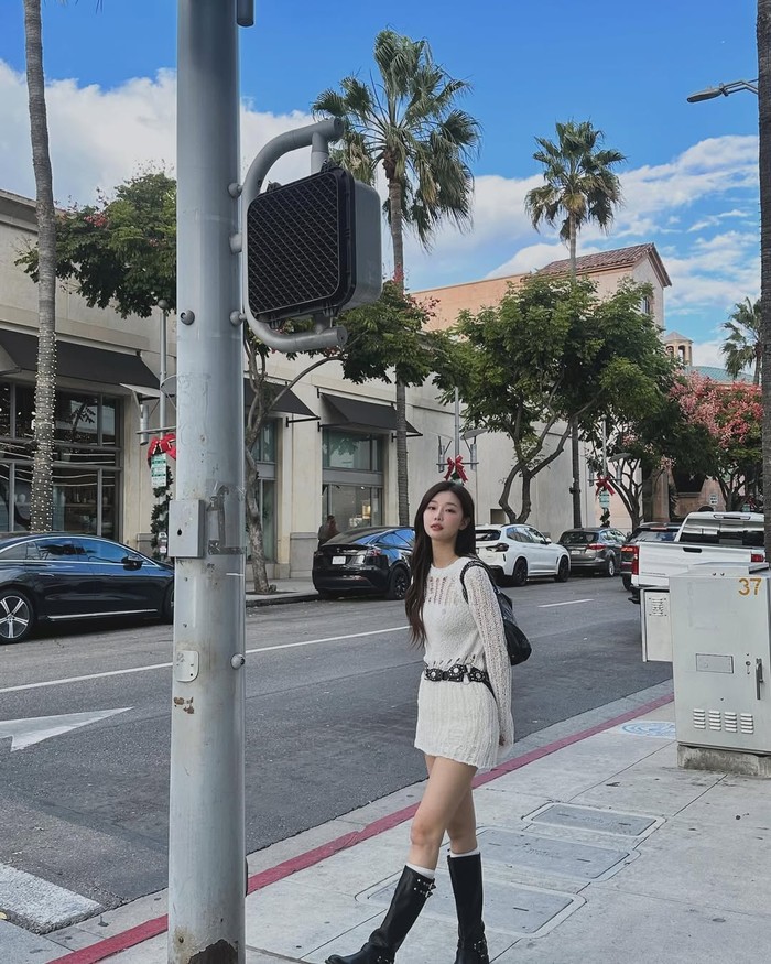 Mini dress rajut putih dengan aksen transparan menciptakan tampilan yang chic. Boots tinggi hitam dan tas kulit berwarna senada menambah kesan modern yang sleek dan fashionable.