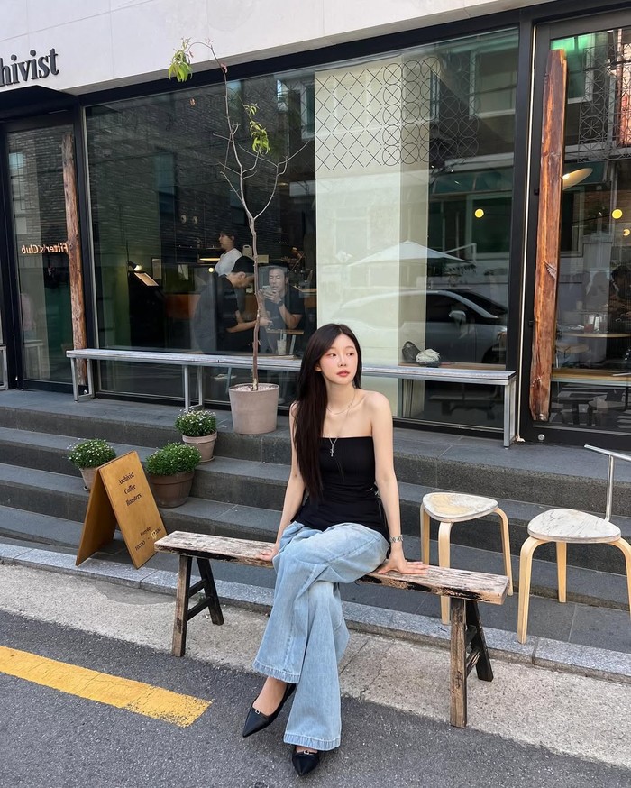Tube top hitam yang dipadukan dengan wide-leg jeans menciptakan tampilan yang simpel namun tetap stylish. Sepatu pointed-toe heels menambah kesan elegan dan membuat outfit ini cocok untuk acara santai atau kencan kasual.