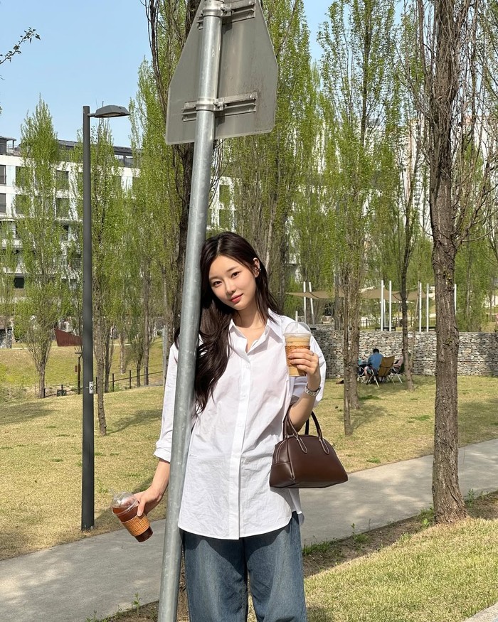 Look ini sangat ideal untuk aktivitas sehari-hari seperti nongkrong di kafe atau jalan-jalan santai. Tambahan aksesori seperti tas besar dan rambut yang dibiarkan tergerai membuat gaya ini semakin natural namun tetap fashionable.
