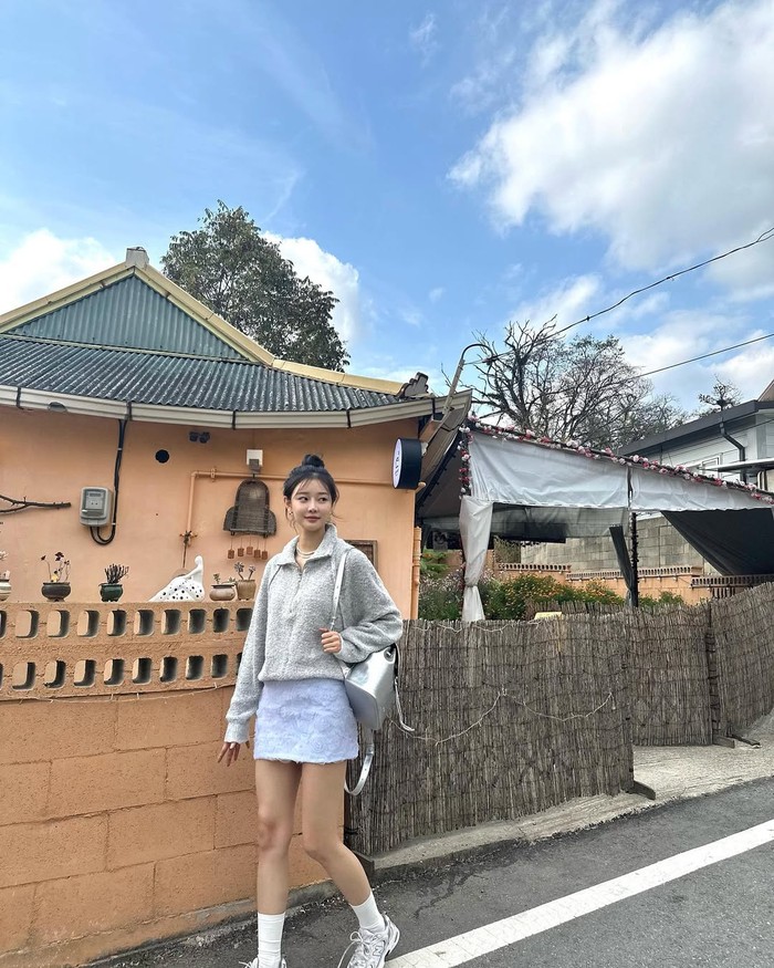 Sneakers putih dan kaos kaki panjang semakin memperkuat kesan playful dalam outfit ini. Dengan tambahan tas simpel dan gaya rambut ponytail, look ini semakin terlihat imut dan modis.