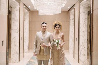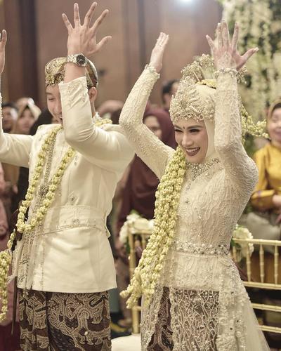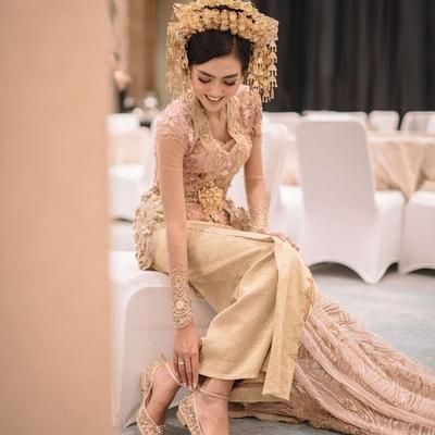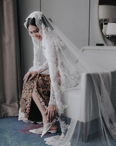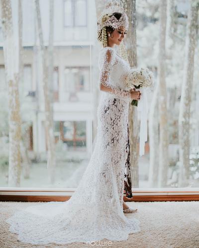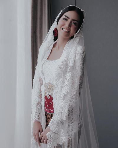 Model kebaya brokat yang ia kenakan, mungkin akan jadi hits di tahun 2019 ini. Untuk acara siraman dan midodareni, ia memakai kebaya putih dan kebaya merah rancangan Vera Kebaya. Sementara untuk akad, ia dengan bangga memakai kebaya rancangan desainer favoritnya, Biyan.