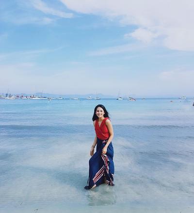 Menikmati indahnya pemandangan pantai, kamu bisa tiru gaya Maudy Ayunda nan santai. Warna merah maroon dan biru navy akan jadi pilihan yang matching. Sebagai paduan rok lilit, kamu bisa pakai sleeveless top dengan detail surplice neckline yang menimbulkan siluet menyilang dan kerah berbentuk V.