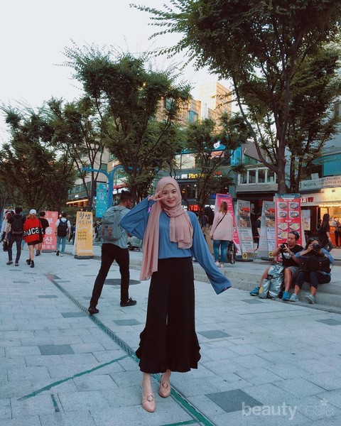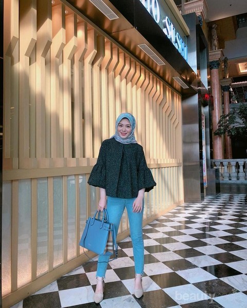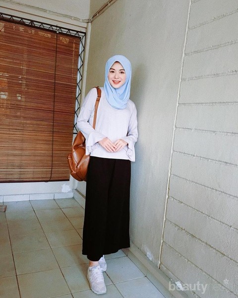 Setelan yang satu ini wajib banget kamu miliki. Selain netral, setelan ini juga masih bisa dipasangkan dengan outfit jenis lainnya. Seperti outer, jaket atau bahkan sabrina. Kamu juga bisa menambahkan aksesoris lain dengan warna yang kontras, seperti hijab putih dan sepatu cokelat yang dikenakan Ayana Moon.