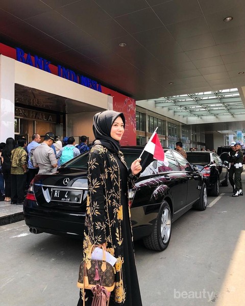 Gamis bermotif dengan warna dasar hitam itu tampak begitu elegan di tubuh Ayana Moon. Kamu bisa memadukan gamis bermotif seperti ini dengan hijab segi empat atau warna senada dengan motif di baju seperti yang dikenakan Ayana kali ini. Meskipun simpel, namun tetap terlihat manis dan elegan ya, Ladies.
