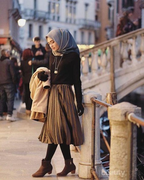 Rok plisket midi dengan detail lipatan akan sangat anggun untuk digunakan dengan basic top dan stocking panjang. Style ini juga cukup sering dipilih untuk tampilan manis saat berjalan-jalan di luar negeri. Namun, tidak ada salahnya untuk mengenakannya saat hangout ke kafe karena tampilan ini cukup simpel dan manis.