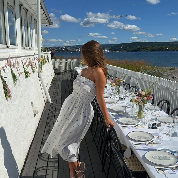 Leah Isadora Behn, anak kedua Putri Märtha Louise dari Norwegia, baru saja meluncurkan lini kosmetik miliknya yang disebut Dorah. Pada acara peluncurannya di Lille Herbern, perempuan 19 tahun ini mengenakan gaun floral biru-putih dari H&M, yang hadir dalam siluet smocked-bodice dress. Untuk alas kaki, ia memilih sandal tinggi yang strappy dari Zara.