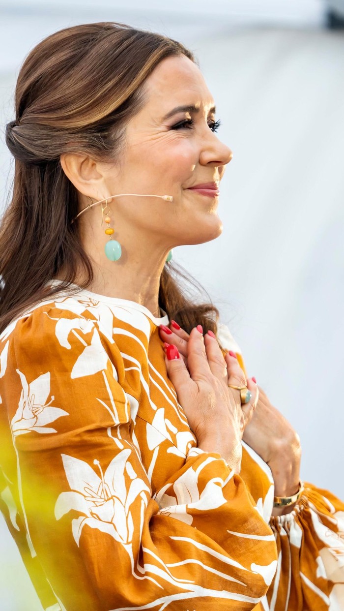 Ratu kelahiran Australia ini memilih gaun maxi bermotif bunga oranye, sepasang sepatu pumps berwarna serupa, dan kacamata Gucci. Ia juga mengenakan kalung emas dengan liontin 'F', sebuah isyarat manis untuk menghormati suaminya, Raja Frederik.