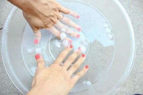 3. Rendam kuku ke dalam air dingin tadi. Biarkan selama 2-3 menit. Setelah itu angkat kuku dari rendaman air dingin.