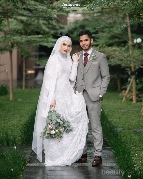 Terakhir, si cantik hijabers asal Bogor, Hamidah Rachmayanti juga menggunakan gaun pengantin bertema Internasional untuk pernikahannya. Gamis panjang dengan bahan lace dominan membuatnya tampil cantik dan elegan saat hari pernikahannya. Veil panjang dengan detail bordir bunga mawar cantik pun menambah kesan mewah pada tampilannya.
