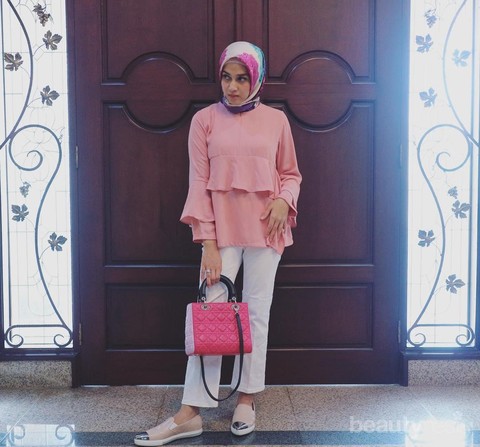 Selanjutnya, ia memadukan dengan celana putih sehingga tampilannya terlihat cerah, feminine, dan rapih. Ia juga mengenakan hijab bernuansa warna pink dengan motif bunga yang besar-besar. Jika ingin menambahkan aksen pada tampilan kamu, coba deh trik yang digunakan Nina, yaitu dengan menggunakan tas bernuansa pink namun dengan tone shades yang berbeda.