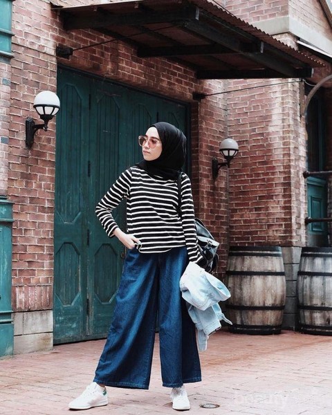 Bahan denim bisa jadi bahan untuk celana kulot? Bisa dong! Malah, bahan denim jadit favorit untuk dijadikan celana kulot. Bahan denim yang akan dijadikan celana kulot ini adalah bahan denim yang ringan agar si pemakai celana kulot tidak kepanasan. Untuk mix and match celana kulot untuk hijabers dengan bahan denim ini, kamu bisa memakai atas kaus lengan panjang bergaris untuk casual style. Dijamin nggak akan failed!