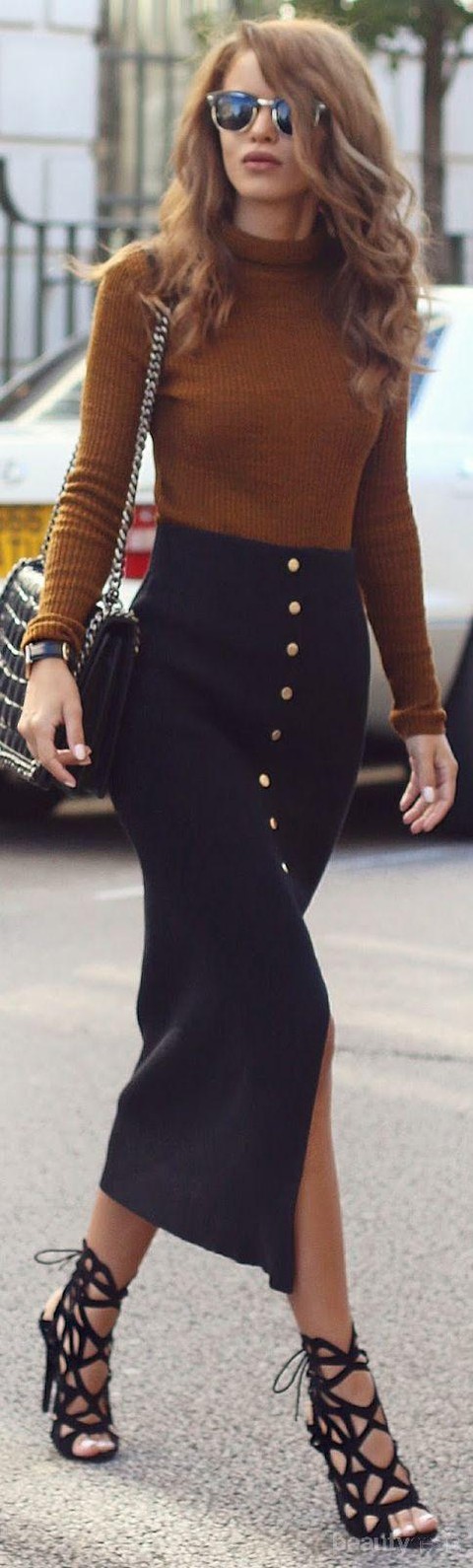 Padu padan sweater yang terakhir ini cocok untuk kamu yang ingin punya look feminim and sexy. Sweater warna pastel dipadukan dengan black maxi skirt dan black gladiator heels akan menghasilkan penampilan yang super elegan. Yuk, dicoba!
