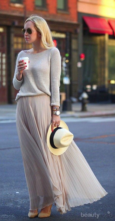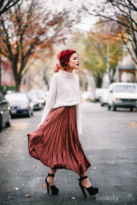 Pleated skirt memang enggak pernah ketinggalan ya. Sweater kamu berpadu dengan long or midi pleated skirt? perfect combination! Jangan lupa padukan dengan high heels atau platform shoes supaya penampilan kamu makin terlihat kece!