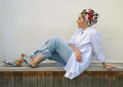 Foto: https://www.dinatorkia.co.uk/style/sun-sea-and-pebbles-ad/Gunakan Scarf dengan Motif Senada