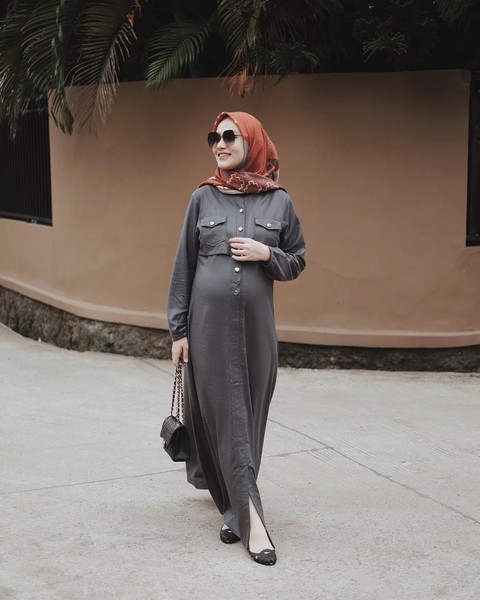 Menghadiri acara formal pun, sebagai bumil yang selalu tampil kece dengan outfit pilihannya, Uwik mengenakan tunik sepanjang mata kaki dengan kancing di depan yang berwarna dark silver. Tak melulu harus mengenakan hijab style dengan warna yang senada dengan outfit, kali ini Uwik memakai hijab segi empat berwarna terracotta dan messenger bag berwarna hitam. Nah, untuk memaksimalkan penampilannya, Uwik juga mengenakan shoes berwarna hitam. Too classy!