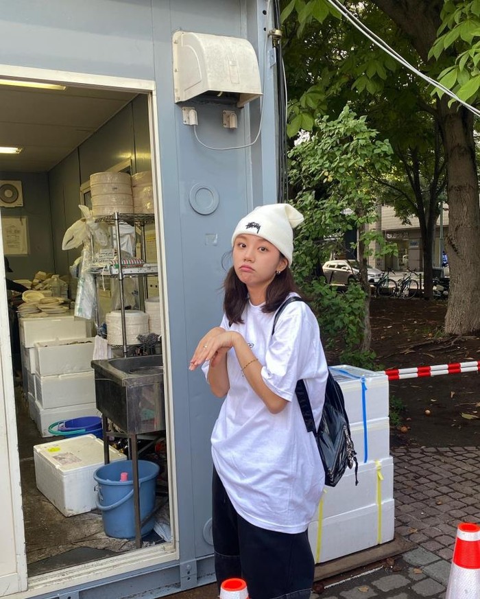 Hyeri terlihat tetap stylish dengan mengenakan pakaian santai dan nyaman ketika berpergian ke Jepang. Ia mix and match ransel hitam mengkilap dengan T-shirt putih oversize, serta beanie putih untuk memberi highlight.