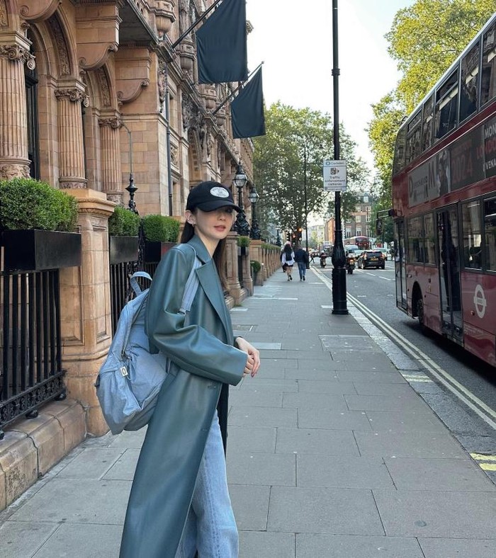 Kang Min Kyung melakukan mix and match ransel katun miliknya dengan mantel panjang kulit yang bernuansa musim gugur. Ia menambahkan ball cap untuk tetap menunjukkan style dengan suasana santai.