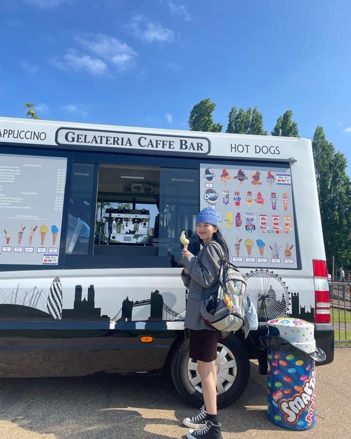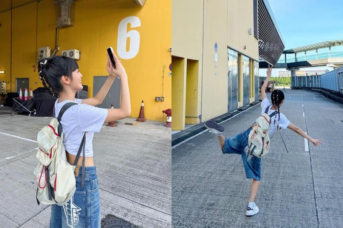 Minnie memilih tas ransel dengan garis merah ceria yang ia mix and match dengan suasana Y2K. Ia memadukan cropped T-shirt dengan celana pendek denim yang mengingatkan kita pada tahun 2000-an.
