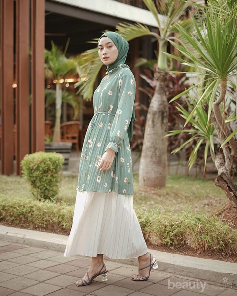 Foto: https://www.instagram.com/alfdns/Selain celana, tunik juga dapat dipadukan dengan bawahan rok untuk mendapatkan kesan yang lebih feminin dan chic. Salah satunya adalah dengan rok plisket. Rok dengan detail lipit ini memang tengah menjadi tren di kalangan hijabers ya, Ladies. Kamu bisa memadukan rok plisket dengan tunik yang juga beraksen plisket sehingga penampilan tampak unik namun tetap elegan.