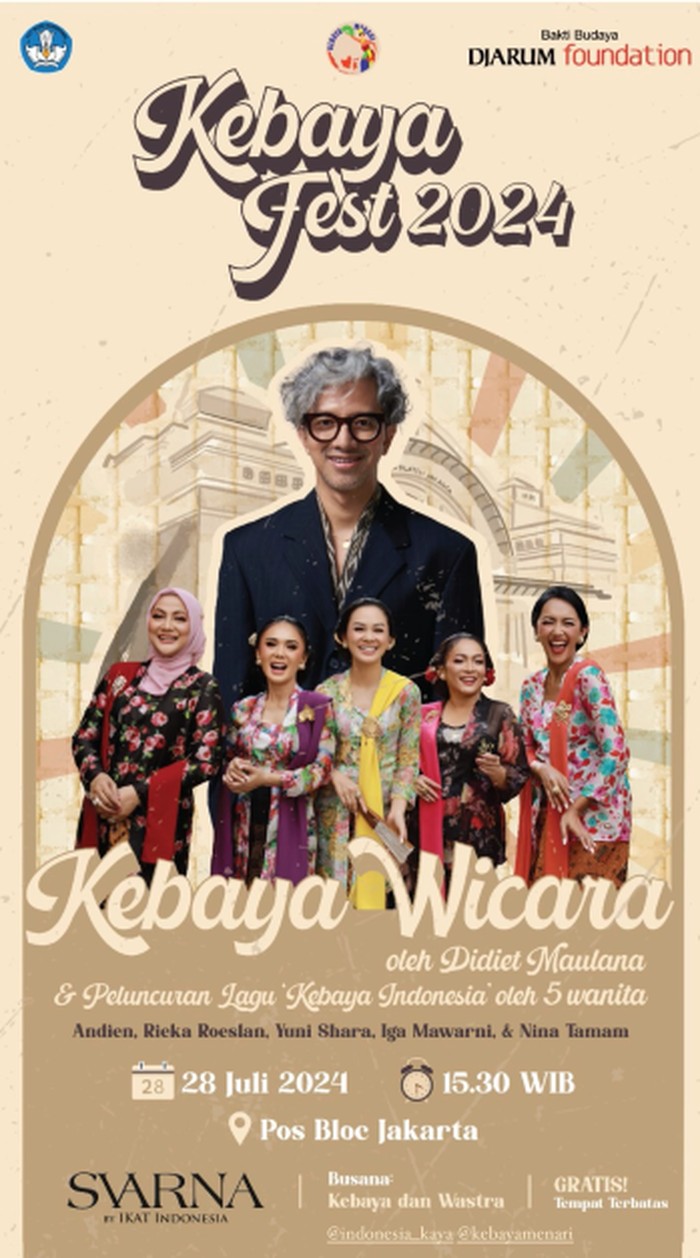 Kebaya Fest 2024 Kebaya Wicara oleh Didiet Maulana sekaligus peluncuran lagu Kebaya Indonesia sebagai lagu yang diciptakan khusus untuk Hari Kebaya Nasional dinyanyikan oleh 5 wanita (Andine, Rieka Roeslan, Yuni Shara, Iga Mawarni, dan Nina Tamam).