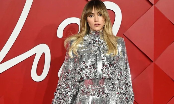 Suki Waterhouse mengenakan busana rancangan Alexandre Vauthier, yakni gaun bervolume sepenuhnya tertutup sequin silver. Tertutup rapat dengan kerah turtleneck, lengan panjang, dan bagian rok asimetris, kekasih Robert Pattinson ini makin eye-catching dengan boots yang matching dengan outfit tersebut.