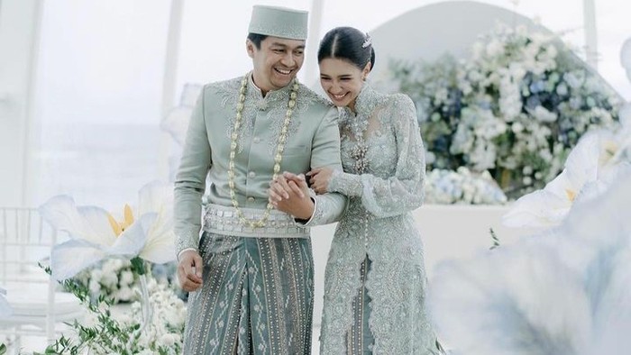 Sementara itu, Deva Mahenra memakai jas pengantin berwarna senada yang dipadukan dengan kain songket dan peci berwarna hijau tosca.