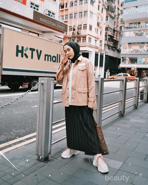 Gaya hypebeast tak melulu memainkan warna terang dan bold. Coba saja intip gaya hijab influencer @strngrrr ini. Wanita bernama asli Intan Khasanah ini memix rok plisket coklat kekinian dan parka berwarna pink salem. Kunci dari gaya hypbeast memang berada di sneakers. Dia mengenakan sneakers senada dan tambahan tote bag coklat.