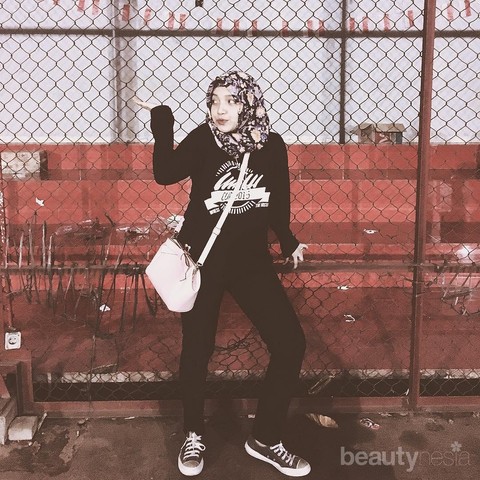 Hijabers satu ini terlihat simpel tapi tetap hypbeast dengan mengenakan sweatshirt dan highwaisted jeans. Agar sedikit berwarna Intan memakai hijab bermotif. Semakin lengkap dengan sling bag putih dan sneakers dari converse. Gaya satu ini cocok kamu gunakan untuk hangout bersama teman/