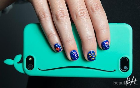 Selain warna yang sama, kamu dapat memilih tema yang sama untuk nail art dan phone case seperti gambar di atas. Phone case paus warna biru muda yang lucu ini dapat dipadukan dengan nail art bertema laut. Kuku dapat dicat dengan warna biru tua yang menggambarkan laut. Tidak lupa berbagai makhluk laut lain pada kuku kamu, seperti kuda laut, bintang laut atau ubur-ubur. Kamu bisa memilih hewan laut favorit untuk "berenang" di kuku kamu.