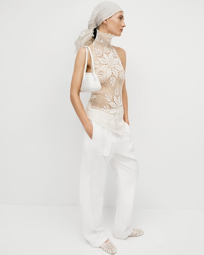 Salah satu koleksi Magda Butrym, atasan lace siluet halter. Magda Butrym menjadi salah satu pelopor kebangkitan lace dan crochet di era modern. Sejak beberapa tahun silam, mereka konsisten menggunakan rajutan dan bordir/ Foto: instagram.com/magdabutrym