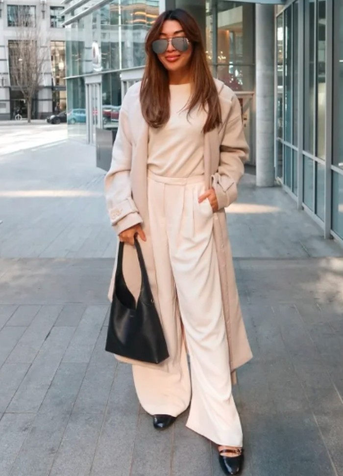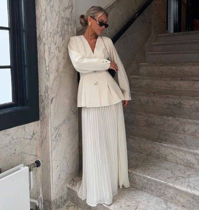 Padukan outer putih dengan inner berwarna netral seperti beige, ivory, atau pastel untuk tampilan yang lebih harmonis. Jika ingin lebih santai, kamu bisa mengenakan celana palazzo atau kulot sebagai bawahannya. Bagi yang berhijab, pemilihan hijab dengan motif sederhana atau warna senada akan membuat tampilan semakin on point. Sebagai pelengkap kamu bisa tambahkan pointed heels atau flat shoes dengan aksen unik, dan clutch dengan detail emas atau perak untuk memberikan sedikit statement pada outfit-mu!