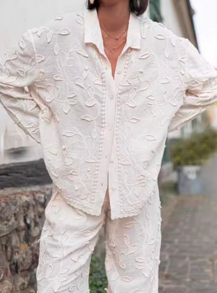 Setelan putih dengan detail tekstur bisa jadi pilihan yang sempurna untuk kamu yang ingin tampil beda tapi tetap elegan. Motif bordir memberikan sentuhan artistik dan mewah tanpa terlihat berlebihan. Pilihan setelan dengan bahan yang ringan seperti katun atau linen juga memastikan kenyamanan saat dipakai seharian.