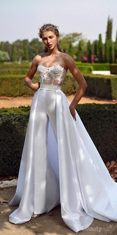 Foto: https://id.pinterest.comSimple namun tetap elegan. Itulah kalimat penggambaran yang paling pas untuk inspirasi gaun pengantin dengan celana satu ini. Gaun tube top ini cocok sekali dipakai untuk kamu yang suka memperlihatkan bagian pundak.