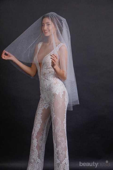 Foto: https://id.pinterest.comWalau tidak mengenakan train ataupun ballgown, inspirasi gaun pengantin satu ini tetap terlihat stunning dan sexy. Motif brokat yang didesain pada jumpsuit satu ini terlihat lebih senada dengan wedding veil yang dikenakan.