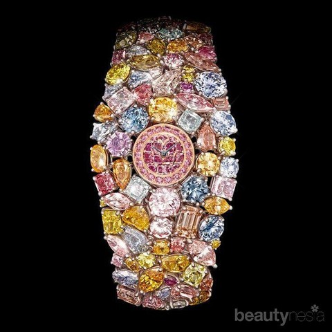 Foto: IstimewaJam termahal berikutinya masih dari merk Graff Diamonds, sebuah rumah berlian yang berbasis di London. Dibuat dengan paduan berbagai jenis berlian warna membuat tampilannya menjadi lebih mewah. Hadir dalam bentuk gelang berbahan platinum yang yang dihiasi berlian warna-warni senilai 110 karat, terdiri dari warna kuning, merah muda, hijau, biru serta jingga. Selain itu, pencipta jam ini memotong permata menjadi berbagai bentuk seperti hati, pear, marquise, emerald hingga bulat. Harganya sangat fantastis, dibanderol hingga 757 Miliar Rupiah.