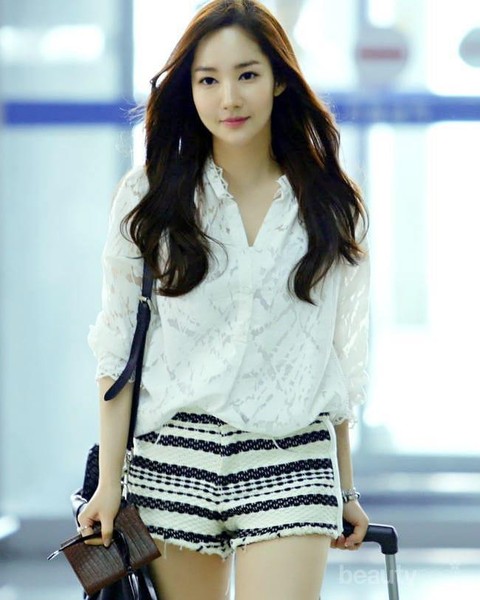 Jika kamu bingung untuk memadu padankan hot pants milikmu, kamu bisa memadukannya dengan blouse putih lho. Nah, hot pants kali ini yang dijadikan inspirasi fashion Park Minyoung adalah hot pants berwarna dasar putih dengan motif garis hitam. Jadi, padukanlah dengan blouse putih seperti ini. Cute kan!