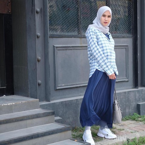 Selain dengan kemeja bermotif garis, rok tutu juga sangat cocok dipadukan dengan kemeja bermotif kotak-kotak. Gaya pemain Film Surga yang Tak Dirindukan ini bisa menjadi contoh. Warna biru tua pada rok tutu berhasil menyatu dengan warna biru muda dari kemejanya. Hijab yang dipilih adalah warna lebih bright.