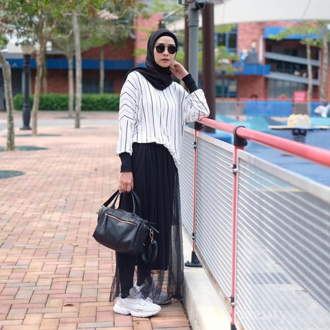 Paduan hitam dan putih memang tidak pernah membosankan. Sama seperti yang dilakukan wanita 31 tahun ini memadukan rok tutu hitam dengan atasan kemeja putih bergaris vertikal. Garis ini dipilih untuk memberi ilusi terlihat lebih ramping. Semakin sempurna dengan pilihan hijab hitam, kacamata hitam, tas jinjing hitam, dan sneakers berwarna putih. Paduan yang simpel, bergaya santai namun tetap manis.