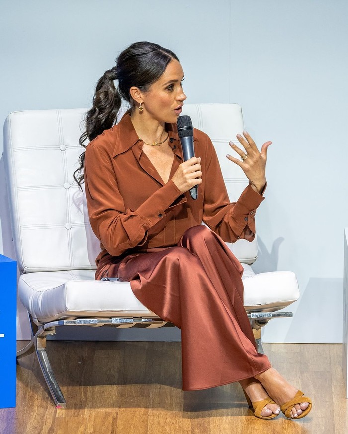 Meghan bergabung dengan Pangeran Harry di atas panggung untuk diskusi panel tentang keamanan online. Diskusi tersebut merupakan salah satu kegiatan utama mereka dalam perjalanan ini. Pada momen itu, ia mengenakan kemeja silk coklat karya Victoria Beckham, celana dari La Ligne, dan sandal Aquazzura.