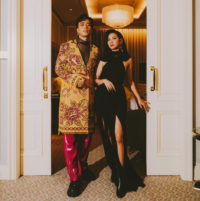Jubah atau coat Vidi Aldiano tersebut merupakan koleksi FW23 Studio Moral. Gayanya vibrant dengan motif floral dan paduan leather pants nuansa pink. Sementara gaun hitam Sheila Dara merupakan koleksi dari STELLARISA, yang hadir dalam siluet halter neck dan rok double slit.Â