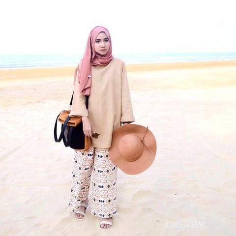 Style hijab ke pantai lainnya yang bisa kamu tiru yaitu dengan memadupadankan blouse dan pants. Gaya ini memang cocok banget buat kamu yang lebih suka tampil casual dan enggak mau ribet. Kamu bisa mengombinasikan blouse dan pants kesayanganmu ya ladies. Eits.. jangan lupa gunakan topi dan sungless biar enggak panas ya.