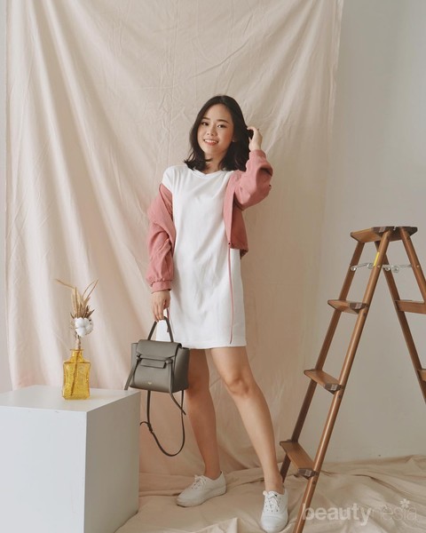 OOTD style yang pertama ala molita mengenakan dress putih diatas lutut yang dikombinasikan dengan boomber jacket warna pink. Menggunakan warna yang soft dan pastel ini membuat yang memakainya terkesan muda dan manis. Kamu mau sedikit sentuhan casual? Coba padukan dengan white sneakers agar style kamu terkesan sedikit sporty.