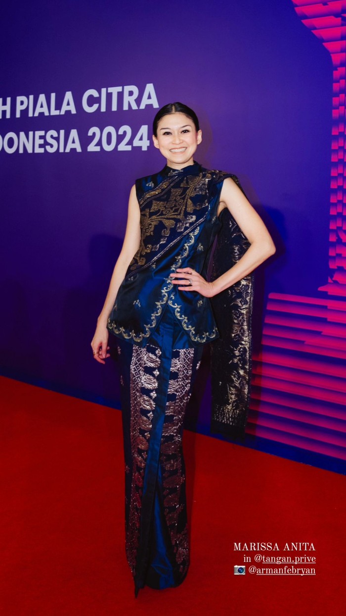 Marissa Anita tampil etnik dalam balutan gaun dari Tangan Prive. Gaunnya memadukan atasan bergaya cheongsam tanpa lengan dan rok kain panjang.