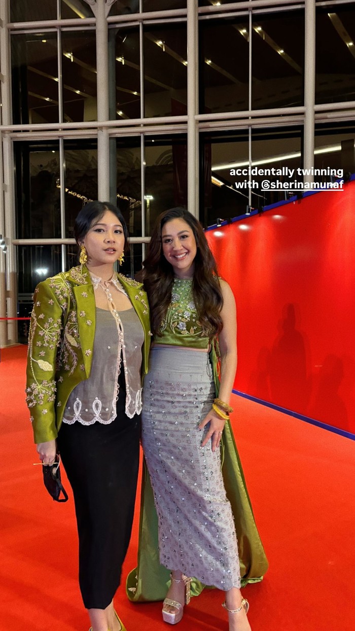 Meski tidak direncanakan, Agnes Naomi dan Sherina Munaf sama-sama memakai outfit hijau senada. Agnes Naomi dengan blazer hijau dikombinasi gaun strapless hitam dan kemeja transparan, Sherina Munaf dengan rok abu-abu dan atasan hijau berekor panjang. Menariknya, outfit hijau mereka sama-sama berhias payet-payet yang indah.Â