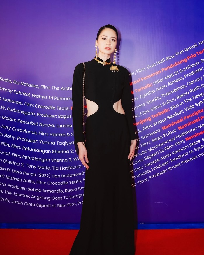 Laura Basuki pakai gaun hitam panjang dari Kraton Auguste Soesastro, yang memukau dengan aksen cut-out. Perhiasan dari Tulola turut dikenakannya untuk menambah kesan glam. Stunning!
