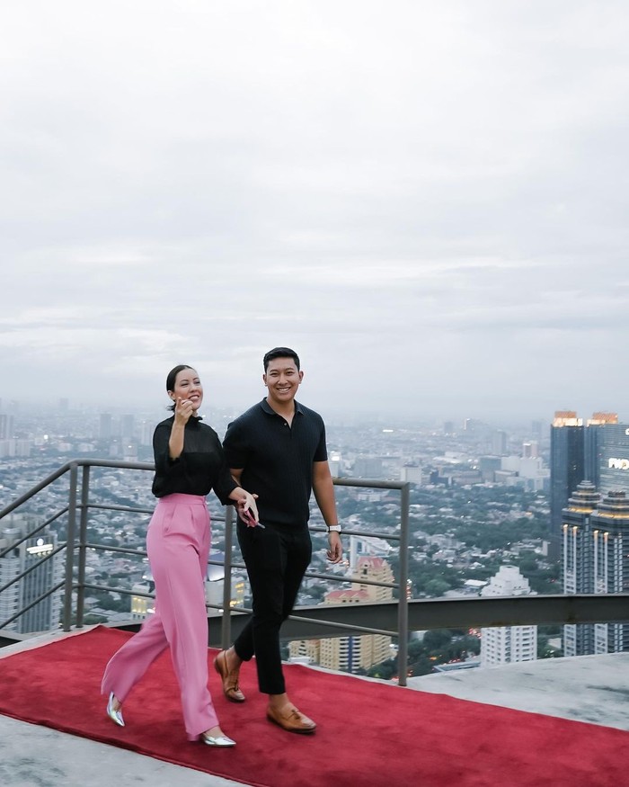 Makan malam romantis di rooftop dengan pemandangan lampu kota, Darma dan Patricia tampil anti ribet dengan gaya simpel mereka. Keduanya setia pakai setelan hitam polos, dengan Patricia mengenakan celana warna merah muda yang lembut. Look mereka disempurnakan dengan sepatu pantofel dan high heels.