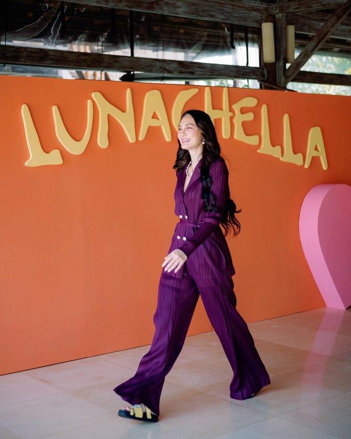 Di Lunachella, Luna Maya sempat mengenakan setelan baju nuansa ungu nan bold yang terdiri dari blazer kancing dobel dan celana panjang. Setelan tersebut hadir dalam material kain lipit dengan potongan yang longgar. Kesannya klasik dan dinamis bak lady boss.