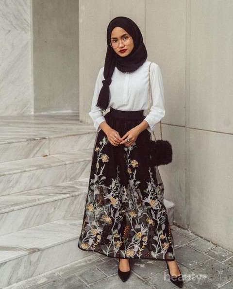 Tampil chic dengan mengenakan rok corak flower bisa jadi pilihan untuk penampilan casual kamu. Kamu tidak usah mengenakan atasan yang ribet, cukup atasan polos tetap bisa membuat penampilan kamu terlihat fashioanble. Jangan lupa untuk kenakan warna hijab netral seperti hitam ya ladies. Nah, kira-kira model hijab mana nih ladies yang jadi favorit kamu?